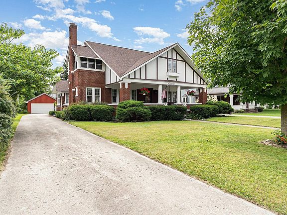 This 4-bedroom, 2-bath, 2,800 sq ft historic home in the heart of Bad Axe was built in 1926 and will celebrate its 100th birthday next year. Ideally located near schools, shopping, parks, restaurants, the local bakery, and just 15 miles from Lake Huron beaches, including Port Crescent, Caseville, and Port Austin, the home showcases beautiful original woodwork, stained glass, and built-in storage throughout. Large windows bring in natural light, and the spacious layout offers a main floor bedroom, family room, cozy living room with a gas fireplace, formal dining room, and a charming breakfast nook. Upstairs, the oversized primary bedroom—once a ballroom—features a converted sunroom walk-in closet, while another bedroom also offers a large walk-in. The kitchen has been completely remodeled, the roof is newer, and the walkout basement provides excellent storage. Outside, enjoy the large front porch swing to watch parades go by, or relax in the yard with a fire pit, blooming flowers, pear, cherry, and mulberry trees, plus raspberry and strawberry bushes. A detached 2-car garage includes an attached workshop and two 220-amp electric boxes, making this historic home as functional as it is full of character.