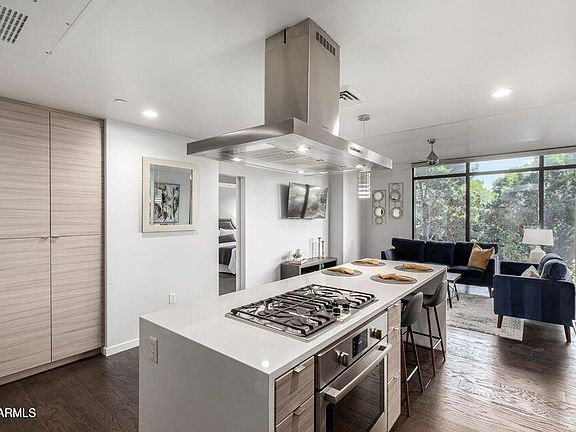 Live in urban luxury at Portland On The Park in downtown Phoenix with the perfect blend of city life & modern convenience. Luxurious 1 BR 1 BA 891 sq ft 3rd Floor Condo offers a contemporary design, open concept, floor to ceiling windows. Prime condo location on 3rd floor directly above the serene world famous Japanese Friendship Garden (water features and peaceful trails) to view from condo or on your own private balcony w/peaceful views & tons of natural light. The lush greenery, koi ponds, walking paths, & waterfalls of the garden brings the outdoors indoors in this very unique & desired condo placement. The modern kitchen boasts quartz countertops, sleek cabinetry, island, & SS appliances w/gas cooktop with seating for 4. The adjacent great room's expansive windows & unique corner patio overlook the lush greenery, koi ponds, walking paths, & waterfalls of the Japanese Friendship Garden. Spacious executive primary BR with north facing views, walk-in closet, extensive cabinet enclosures, ensuite bath w/dual sinks & elegant walk-in shower. Building amenities are first class & include state-of-the-art rooftop lounge w/panoramic breathtaking views of Phoenix, Camelback & Piestewa Peak Mountains, the Japanese Friendship Garden & Hance Deck Top Park to the north & expansive cityscape & South Mountain views to the south with the tree-lined Portland St park in front. The heated pool, fitness center, welcoming lobby, 24-hr concierge (handles deliveries), gas BBQ grills, fire pit, multiple TVs, & 7th Floor outdoor patio lounge add additional amenities. Close to light rail, coffee & wine bars, restaurants, museums, dog park, sporting events, & the airport. This condo is a perfect home, executive flat, or short-term rental (31+ days or longer). Furniture and household items included with the sale including brand new washer and dryer and a new King Size Bed from Macys.