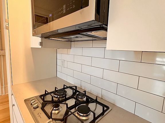 Comfortable amenities include, maple hardwood floors, exposed brick, steel appliances, quartz countertop, porcelain bathroom, in-unit washer and dryer, central A/C and heating, dishwasher, microwave and convection oven.