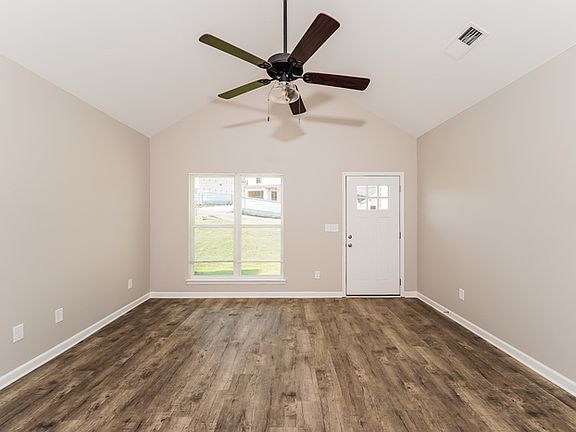 Inside, vaulted ceilings and LVP flooring set a warm, airy tone across the open living area. Large windows draw in natural light, while a neutral color palette provides the perfect backdrop for any style. The kitchen features sleek stainless steel appliances, ample cabinetry, and plenty of counter space, ready for your next meal or weekend baking project.