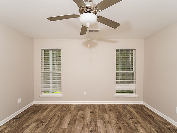Each bedroom offers comfortable proportions, ceiling fans, and generous closet space. The primary suite includes a private bathroom with a double-sink vanity and elegant finishes, while the second full bath offers a polished, practical setup for guests or daily routines.
