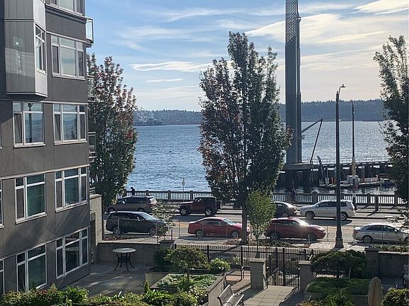 Terrific opportunity to own a waterfront condo near all the action. Enjoy concerts on the pier, wander south to the Aquarium or shop at Pike Place Market. Westerly views of Elliott Bay and charming courtyard from unit. Quaint deck with French doors provides a lovely spot for your morning coffee. Open floor plan with combo living/dining area. Kitchen had gas stove, breakfast bar and wood cabinets. Spacious primary bedroom has walk-in closet. Big den with half bath is currently used as second bedroom. 865ft condo is very quiet and secure. Amazing building amenities include rooftop deck, club room, spa and gym, conference room and concierge. Garage pkg and storage. Pets are welcome as are short term rentals. Unit has established Airbnb income.