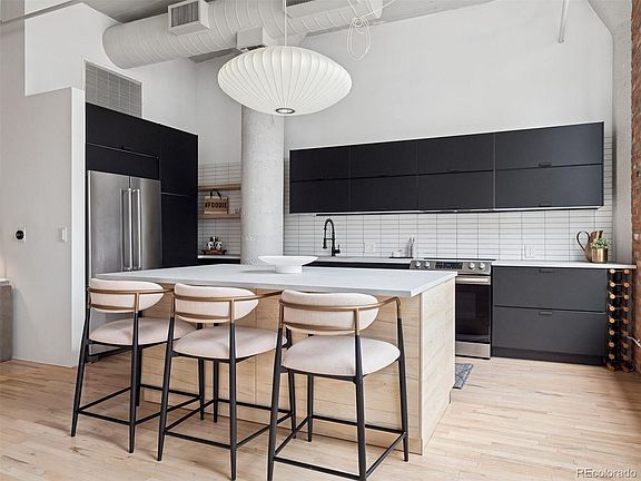 Perched atop the historic Bayly Lofts, this true penthouse residence embodies the essence of downtown Denver living with soaring 12-foot ceilings, oversized windows, and sweeping city-to-mountain views that flood the space with natural light. Fully renovated with refined modern updates, the 1,169 sq. ft. open floor plan balances the raw character of exposed brick and concrete columns with contemporary finishes that elevate both form and function.