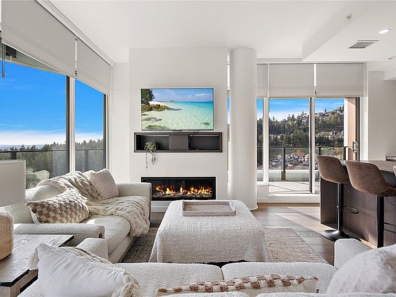 Absolutely stunning views from this 14th floor, corner condo in the stylish and modern, One Bear Mountain. This ultra exclusive 2 bed, 2 bath plan boast over 1300 square feet with a formal entryway and a distinct separation between the living/kitchen/dining and the functional bed/bath and utility areas. Engineered hardwood, floor to ceiling windows, high end Bosch appliances, quartz counters, italian cabinets and gas fireplace are all interior features of the home. A 500 square foot, covered balcony wraps around the entire plan, framing breathtaking panoramas of the valley below all the way out to Mt Baker. Incredible resort style amenities offer an unmatched resident experience. Concierge services, Grenoble Sky Lounge and Business Center, Gym, Yoga Studio, Outdoor Pool and Sundeck plus several indoor and outdoor spaces. Pet friendly building, 2 parking stalls, EV charger, separate storage and in unit. Live, work and entertain in luxury in the exclusive, Bear Mountain community!
