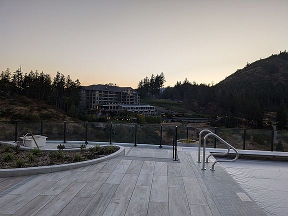 Residents enjoy access to an impressive suite of amenities, including a state-of-the-art fitness centre with premium weights and cardio equipment, an intimate yoga studio, outdoor terraces and lush gardens designed for social gatherings, and a stunning heated rooftop infinity pool with wind-protected lounge areas and panoramic views of Mount Finlayson and Goldstream Provincial Park. A sky lounge and business centre provide flexible spaces for working from home or entertaining.