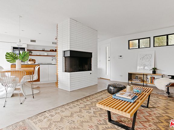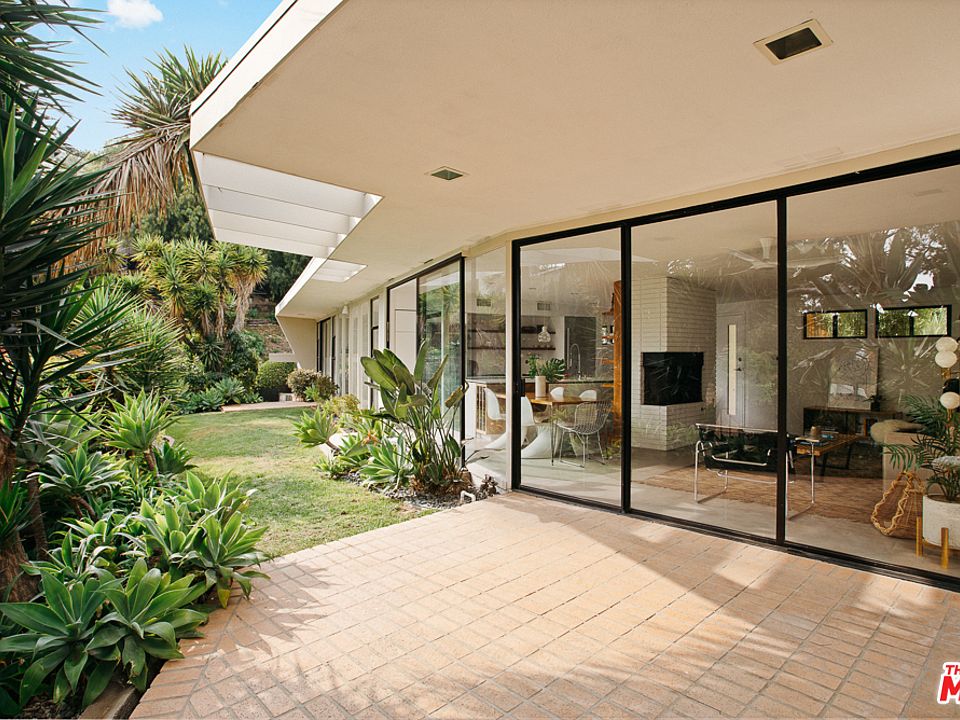 Paradise in the Los Feliz hills! Welcome to 2000 Mayview, a distinctive mid-century modern architectural retreat on an oversized lot, renovated by celebrity architect Linda Taalman, AIA! Sunshine pours into the open living room, dining room + kitchen from a wall of sliding doors + windows that open to the tropical yard, w/plenty of spaces to entertain! Newly refinished concrete floors throughout contrast the fresh white walls + white brick fp, a must-have for any mid-century lover. Designer kitchen boasts Thermador stainless appl., Hansgrohe fixtures, steam oven, quartz counters, open shelving + custom walnut cabinetry + includes a built-in walnut dining table. 2 guest bedrooms offer ample closet space and a wall of windows looking out at the grassy yard. Generous master feat. large custom closet w/plenty of storage. Hall bath boasts custom walnut vanity + shower over tub. Updated systems, 5KW solar system conveys with sale. No more showings. Property in escrow!