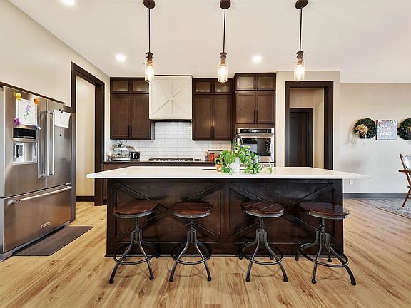 BEAUTIFUL HOME IN ELK RIDGE ADDITION! Enjoy the view of the pond from this 5 bedroom, 3 bath home on over one-half acre corner lot with an oversized three car garage. The house features an open concept living area with large kitchen island, electric fireplace, walk-in pantry, Kitchenaid double oven and dishwasher, luxury vinyl flooring and granite/quartz countertops. The covered deck has a ceiling fan for quiet evenings. The home is a split bedroom design. The master bedroom has a coffered ceiling and drop lights on either side of the bed area. A barn door accesses a large bath with a shower/tub combo, water closet, and walk-in closet that hosts the washer/dryer hookups. In the basement, you'll find a large family room with a wet bar that includes space for a full size refrigerator and granite countertop, two more bedrooms, a full bath, and a storage room with a second washer/dryer hookup. Agent has financial interest in the property.