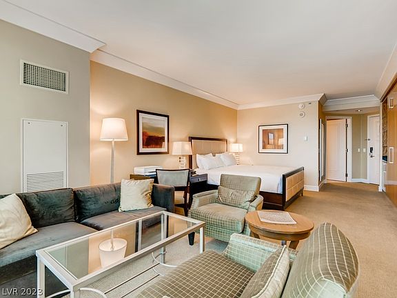 Elegant and inviting Studio Unit with outstanding views of Las Vegas, City & Mountains! This Gorgeous Unit has large king size bed, built in Entertainment Center, Stainless Bosch appliances, Marble Bath with separate jetted tub, dual sinks, lush carpeting, pull out sofa.  Enjoy the lap of luxury with 2 restaurants, pool, spa, state of the art fitness center.  Spa on the property for booking your next massage/facial.  Fine dining and spectacular bar on ground floor with impressive entry including doorman and Valet.  This Unit is adjacent to Unit 3115 also listed--own 2 side by side Units for all your friends & family to enjoy!