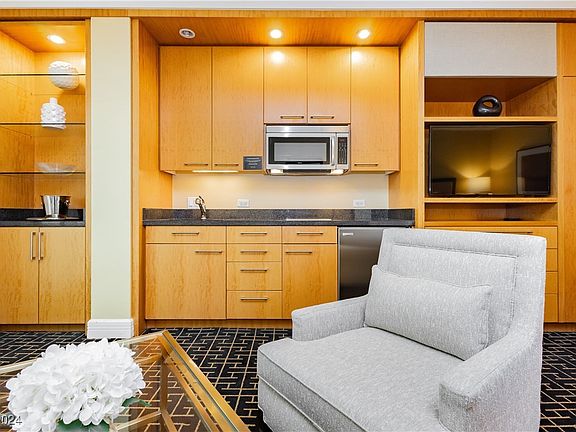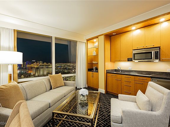 Luxurious Las Vegas living awaits in this elegant 534 sq ft studio condo situated on the 47th floor, offering breathtaking views of the Las Vegas strip, Sphere, and hotel pool. This property showcases the height of luxury with crown moldings, a plush king-sized bed, custom cabinetry, and a state-of-the-art kitchenette. The opulent bathroom is adorned with marble throughout, featuring a double sink vanity and an indulgent six-foot soaking tub. Embrace the resort-style experience of Las Vegas in this exquisite condo, designed for those who seek the finer things in life. This is your opportunity to own a slice of paradise.