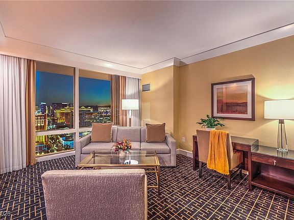 Experience the height of luxury living in Las Vegas with this sophisticated 534-square-foot studio condo, located on the 47th floor and boasting stunning panoramic views of the Las Vegas Strip, the iconic Sphere, and the resort-style pool below. This beautifully appointed unit features upscale touches including crown molding, a plush king-sized bed, custom cabinetry, and a kitchenette. The spa-inspired marble bathroom offers a dual-sink vanity and a generous six-foot soaking tub—ideal for relaxing in style. Blending elegance and comfort, this high-rise sanctuary embodies the essence of resort living right in the center of the city. Own your own slice of Las Vegas luxury today.