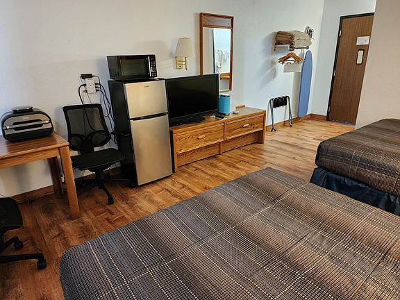 Newly Renovated Fully furnished Single or Double Queen (NON-SMOKING) rooms with All Utilities included (including WiFi and Cable), are Available for Rent! These newly updated rooms are equipped for extended stays with hardwood floors and beautifully tiled showers, among other upgrades. Every unit has a Fridge/Freezer, Microwave, Iron and Ironing Board, Extra Cozy Blankets, and Windowless Heater/Air-Conditioner Unit. We have optional Kitchenette accessories including, but not limited to: Keurig (coffee maker), Hot Plate (single table top burner), Electric Skillet, and a 6-in-1 Ninja (air fryer). Bring your furry friends along, as we are pet friendly as well (minimal pet cleaning fee applies)! Free parking is available on site, with room for larger vehicles (please inquire when applying). There are two designated smoking areas outside. There are 3 different restaurants within a 1-minute walking distance (2 are 24hr dining) . Other walkable attractions nearby include 2 bars/casinos, Dinosaur Museum, and Dawson County Fair Grounds. Makoshika State Park and Short Pines (Off-Road RV Park) and various other small shops, eateries, and parks are within a short driving distance. Please contact us to reserve your Family Orientated Rental today! Fully furnished Single or Double Queen (NON-SMOKING) rooms. The rental cost includes Electricity, Water, Cable, Wifi, and Weekly Housekeeping (including Linens).