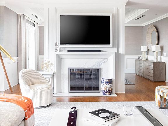 At the heart of the home, a stunning double-sided marble fireplace anchors the spacious den and living room, creating warmth and ambiance throughout. Floor-to-ceiling windows, soaring ceilings, and rich solid hardwood floors enhance the open, airy design.