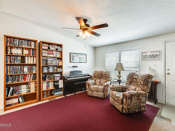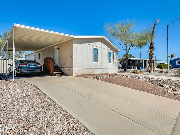 Charming 3-bedroom, 2-bathroom multi-wide mobile home in a tranquil neighborhood offering the freedom of no HOA! The home features a cozy family room, a primary bedroom with a full bathroom, and a kitchen with a pantry and laminate counters, with the refrigerator, washer, and dryer included. Enjoy the convenience of two storage sheds and the benefit of a roof repair and credit during escrow. The home boasts a mix of carpet and laminate flooring throughout. Outside, you'll find natural desert landscaping in both the front and back, while the community offers a playground, a refreshing pool, a clubhouse, and more. With two carport spaces and one additional slab parking space, this home is a perfect blend of comfort, convenience, and community living.