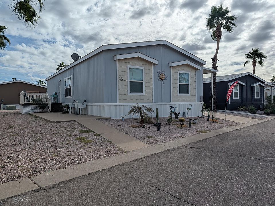 Welcome to this beautifully maintained manufactured home offering comfort, style, and low-maintenance desert landscaping. Located on a peaceful street, this home features great curb appeal with fresh exterior paint, decorative accents, and a spacious front yard adorned with desert plants and rockscape.Step inside to discover an inviting layout with ample natural light, a bright kitchen, and cozy living spaces perfect for both relaxing and entertaining. The home offers three well-sized bedrooms, providing plenty of room for family, guests, or a home office.