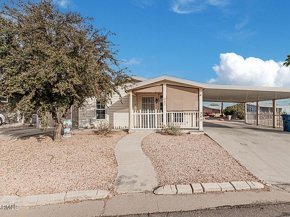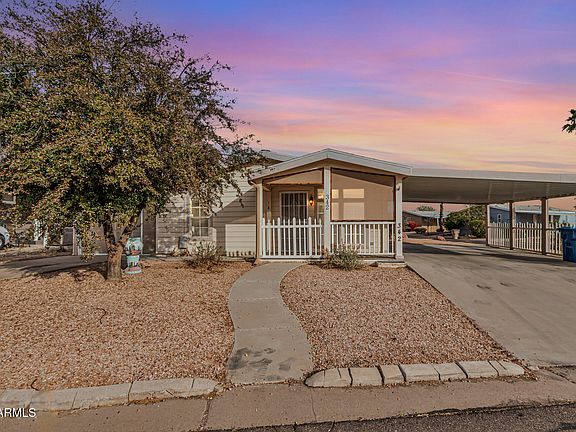 Recently updated manufactured home in the beautiful Buena Vista Community! This gated community is for all ages and offers a dog run, playground, cabana, adult and child activities, covered BBQ area, pool, and clubhouse. The house greets you with 2-carport spaces and a cozy porch. Inside, you'll find a welcoming living room, vaulted ceilings, wood-look flooring, and soothing paint. The eat-in kitchen has stainless steel appliances, a pantry, recessed lighting, a breakfast bar, laminate counters, white cabinetry w/crown moulding, and sliding doors to the screened patio. Fantastic main bedroom features a bathroom with dual sinks, a step-in shower, and a walk-in closet. Enjoy the AZ weather all year round while relaxing on the screened patio. Don't miss out on this opportunity!