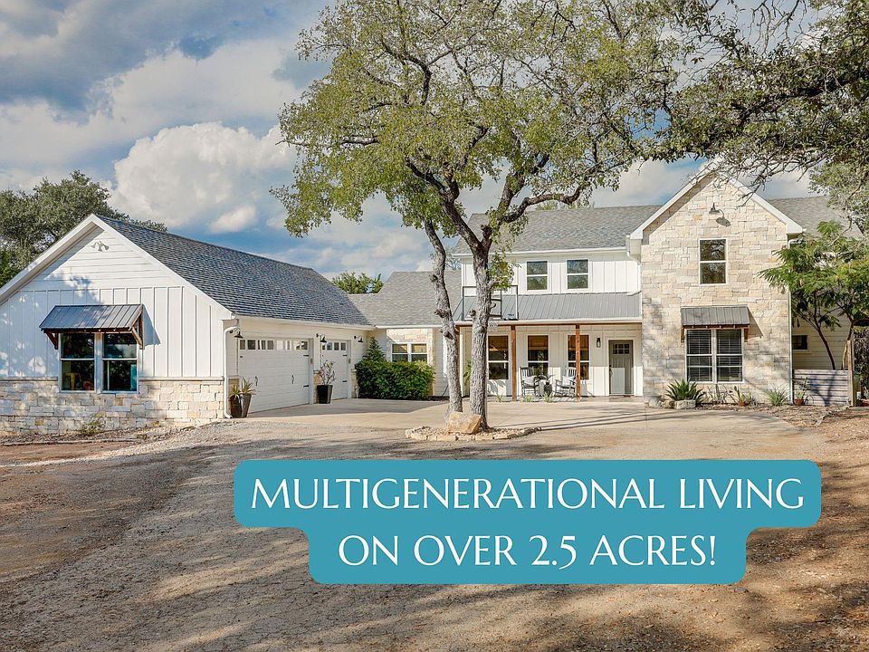 Own 2.5 acres in the Texas Hill Country! This spacious home offers five bedrooms and four full bathrooms, including two primary suites on the main floor. One of the suites features a private entrance, full kitchenette, and patio - ideal for multi-generational living, guests, or rental income. Inside, you'll find vaulted ceilings with exposed beams, wood, stained concrete, and tile flooring, quartzite and butcher block countertops, and two oversized pantries. Each room is equipped with its own mini-split HVAC system for individual temperature control, better air quality, and reduced energy bills! The property includes a 3.5-car garage, an attached workshop, and a full RV hookup with electric and water. Flat, usable land gives you the freedom to add a pool, build a guest house, or even run a bed and breakfast. Minimal restrictions mean endless possibilities, all while enjoying total privacy and scenic views.