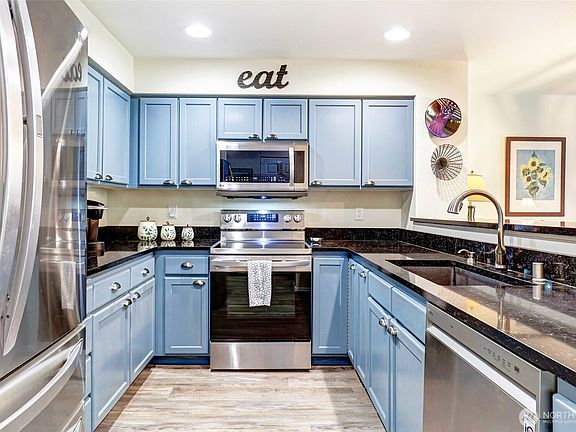 Easy living at Silver Lake! This beautiful 1-level mixes style with everyday comfort. 2 bedrooms, 2 baths, laundry, cozy gas fireplace, and an attached 1-car garage. Upgraded flooring, lighting, vanities, & blinds throughout. The kitchen, with quartz countertops, a convenient eat-in bar, and newer SS appliances is made for the home chef. The primary suite with en-suite heated floors, a charming window bump-out, and walk-in closet organizer also fits a king-size bed. Living & dining flow effortlessly to a private outdoor space ideal for relaxing or morning coffee. The 2nd bedroom offers flexibility as an office or den. Sellers Inspection. Move-in ready, this condo is a block to the lake & close to parks, trails, restaurants, shopping, & I-5.