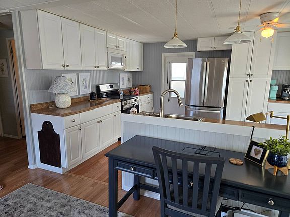 55+ 2/2 Well maintained home in an active community. In 2024 a new roof, gutters and down spouts were added. New AC unit installed in 2024. New custom wood blinds. Kitchen has an open concept with sink base island. Front of home has 2 large Bay windows for the pet and plant lovers.The relaxing living area is bright and with many windows to open for evening cool breezes. Master bathroom has walk in shower and there is a guest bedroom and hallway entrance to guest bathroom. Many park amenities to enjoy. Lot rent $750 with park application approval. Call today for your private tour.
