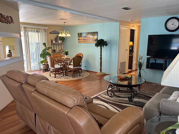 This Beautifully Maintained 2-Bedroom, 2-Bathroom Home is Located on an Oversized Private Perimeter Lot in the Highly Desirable Village Green community, known for its resort-style living and friendly, active atmosphere.  Step inside this home to discover a warm open plan thoughtfully updated featuring new laminate flooring (2022) in main living areas, new carpet (2025) in bedrooms.  Kitchen complete with full pantry, updated with new back splash and fresh paint (2025), Dishwasher (2023), Microwave (2024), Garbage Disposal (2024).  All plumbing to house inspected, kitchen sink drain routed and cleaned (2025).  Both Bedrooms large enough for Queen furnishings, three closets in each for tons of storage, and enjoy direct access to Private En Suite Baths.  Water Heater (2021) drained annually. Water Filtration System (2024).  For peace of mind, a new membrane roof (2020) and rubber coating over the covered carport provide a secure spot for relaxing and enjoying the outdoors.  Enclosed Lanai (2020) remodeled with insulation and sheetrock providing a flex space that can serve as a game room or bonus bedroom.  Attached shed has washer/dryer hookups and provides room for storage.  Vapor Barrier (2022) inspected 2025.  Fully Serviced A/C 2024.  Village Green is a pet-friendly (two pets up to 50lbs) gated community with a monthly lot fee of $760, which includes basic lawn care and access to all park amenities including a resort-style clubhouse complete with billiards room, exercise room, library, and newly renovated swimming pool all designed for active and social 55+ living.  Schedule your private tour today and start your Florida lifestyle in this vibrant community just minutes from shopping, dining, and the beautiful Gulf beaches!