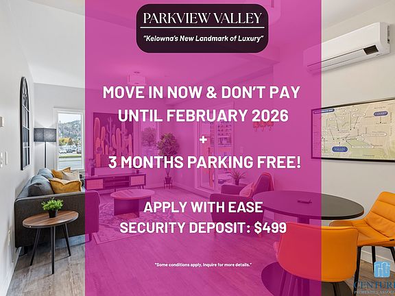 AboutWelcome to a new standard of modern living, Parkview Valley is Centurion's newest premier rental community located in Kelowna. Nestled in a vibrant neighborhood, just steps from Orchard Park Shopping Centre, Parkview Valley offers a harmonious blend of comfort, convenience, and style. Our community consists of Studio's, 1 bedroom, 2 bedroom, and 3 bedroom suites, and offers a vast variety of amenities right at your door to fit your lifestyle.