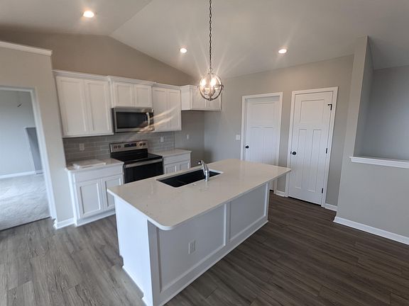 Stainless Steel Appliances, Luxury Vinyl Plank floors, a stove exhaust that is vented to the outside and Solid Surface counter tops add pizzazz to this open kitchen floorplan. The view out basement roughed in for future wet bar, oversized 6 ft sliding door to upper level deck, and 36 " wood burning fireplace add special effects to the well designed home. Master suite has coffered ceiling and solid surface counter tops. This home, close to lakes, walking paths, playground and splash park is nearly finished and will be ready to move into in August, 2022.
