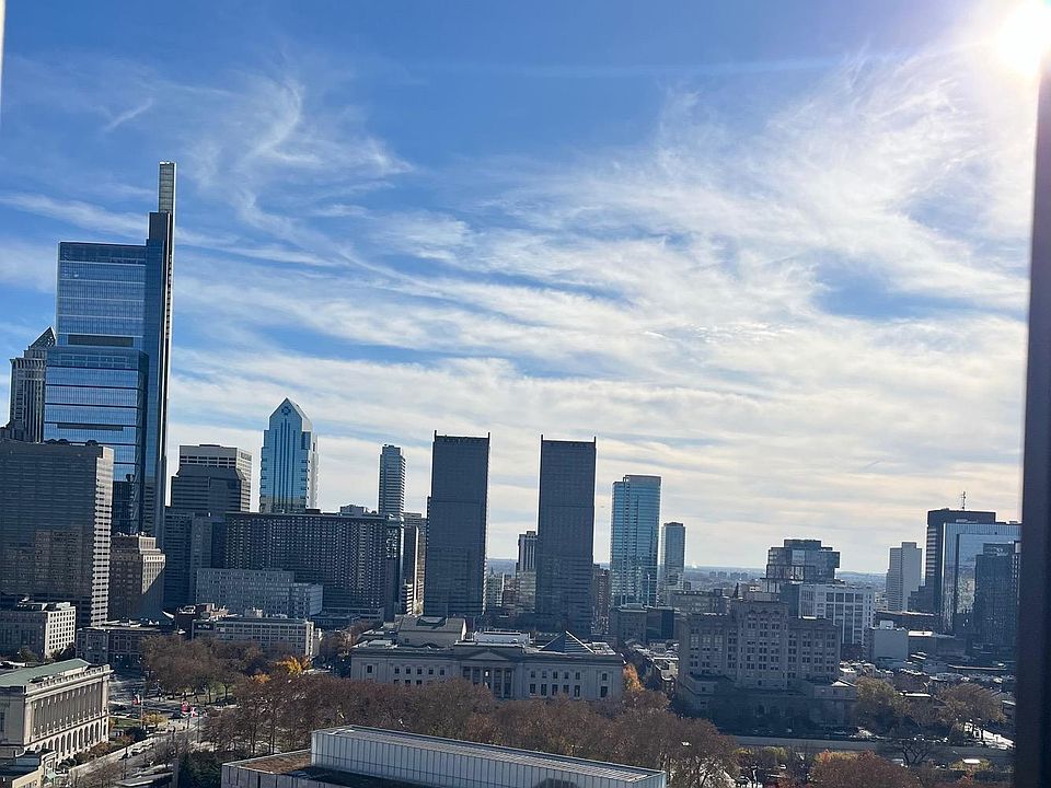 Un-obstructed SKYLINE VIEW and sunny SOUTH exposure from high up in the tower! Large sliding windows. This beautiful comfortable studio features a large OPEN kitchen with STAINLESS appliances, a spacious living room, pretty glass bathroom sink with tiled counter and mirror and an entire HALL of closets! Enjoy the heated POOL with outdoor shower, lush garden with gazebos, lending library and professional gym. Professional on site management and 24/7 desk and security. Parking can be rented in on-site garage and there is ample street parking and other garages and lots around the building. If you are looking for a perfect City Pied-a-Terre, this would be it! Fabulous location in Parkway Museums District!