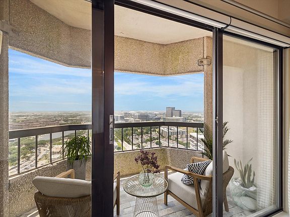 32nd floor unit w/ panoramic birds-eye views of the Med Center & surrounding area from the shaded covered Balcony, Living Room, Dining Room & both Bedrooms open to covered balcony overlooking the VA Hospital, Astrodome & NRG Stadium. Warm hardwoods, in-unit washer/dryer, tankless water heater & custom room darkening roller shades on all windows. Kitchen is light & bright w/ eat-in breakfast space. Fall asleep surrounded by twinkling city lights in tranquil Primary Suite finished w/ sitting area & walk-in closet. Beautifully upgraded Bathrooms. Convenient city living amazing building amenities, inc. 24-Hour Guarded Gate & Valet; Concierge, Grocery, Meal & Dry Cleaning Pick Up & Drop Off; Climate-Controlled Pool; Dry Sauna; Steam Room; Gym; Racquetball & Tennis Court; Running Track; Pet Run; & Outdoor Kitchen. Conveniently located around the corner from the Med Center, Zoo, Hermann Park, Museum District, Miller Outdoor Theater and Bike & Running Trails. Comes w/ 2 deeded parking spaces.