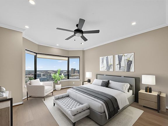Luxury high-rise living on the 33rd floor near the Houston Medical Center! This 2-bedroom, 2-bath residence offers sweeping city views and abundant natural light. Highlights include a formal foyer, crown molding, and a bright kitchen with granite countertops, white cabinetry, and stainless-steel appliances. Washer, dryer, refrigerator, brand-new microwave, and brand-new heater are included. The dining area features bay windows.
