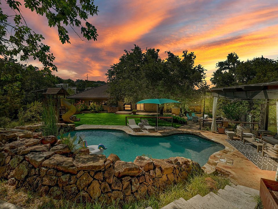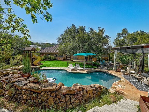 Impressive, fully furnished custom home tucked on a secluded, wooded lot with two wet-weather creeks. The resort-style backyard showcases a pool with slide and waterfalls, garden, fire pit, and multiple patios and decks for effortless indoor outdoor living. A true chef's kitchen features double ovens, a warming drawer, and two walk-in pantries ideal for cooking and entertaining. The expansive primary suite includes a separate shower, soaking tub, and bidet. Four bedrooms and 3.5 bathrooms provide generous space for relaxation. Additional highlights include a custom remote-controlled propane fireplace in the main living area, zoned HVAC, and a recirculating line delivering near-instant hot water to the primary shower. Situated in the Lake Hills community near Commons Ford public park with access to Lake Austin, hiking trails, and beautiful waterfalls. Enjoy nearby favorites like Civil Goat Coffee, JoJo's Bakery, and Patrizi's. Approximately 20 minutes to Downtown Austin and served by exemplary Eanes ISD.