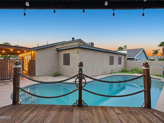 Step into EASY SCOTTSDALE LIVING - a move-in ready 4 bed, 2 bath, 1,659 SQFT home on a desirable CORNER LOT with a POOL and NO HOA. With vaulted ceilings, tons of natural light, and low-maintenance turf in both the front and backyard, this home is set up for EFFORTLESS indoor-outdoor living. Inside, you'll find a light, inviting interior with fresh paint throughout and tile flooring in the main areas and bedrooms for low-maintenance living. The kitchen pops with newly painted white cabinets, a brand-new range/stove, and new microwave, creating a bright central hub that opens nicely to the living spaces. At the heart of the home is a central glass atrium, bringing in beautiful natural light and adding an architectural feature you don't see every day. All four bedrooms are generously sized, with NEW CARPET in one of the bedrooms for added comfort. Outside is where this home really shines. The exterior offers artificial turf in both the front and backyard for year-round green curb appeal with minimal upkeep. The backyard has multiple areas to gather, including a large covered space for dining, room for games or extra seating, and a sparkling pool with a deck-style feature overlooking the water - ideal for summer hangouts, BBQs, and desert evenings under the string lights.