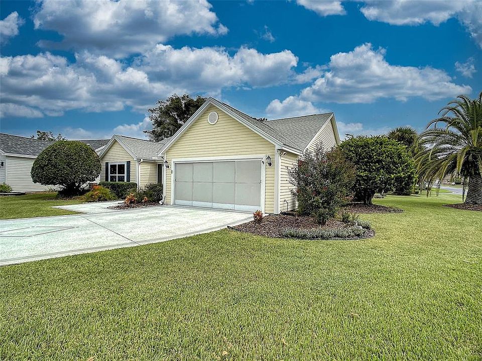 YOU MUST SEE this MASSIVE TWO BEDROOM with FLORIDA ROOM in the Village of Palo Alto with a peek-a-boo view of Tierra Del Sol Championship Golf Course! Over 1800 SQUARE FEET, BOND PAID, NEWER ROOF- 2019! Located on a desirable corner lot with a long, PAINTED DRIVEWAY in The Village of Tierra Del Sol. Enclosed SCREENED FRONT PORCH leads to Double Door entry. A LARGE FOYER area greets you with 18” tile and regal columns as you enter the home. NO CARPET IN THE HOME! The living area features laminate flooring, with VAULTED CEILINGS and LARGE WINDOWS, allowing plenty of Florida sunshine! The upgraded kitchen features solid CORIAN COUNTERTOPS, WHITE CABINETRY, matching STAINLESS APPLIANCES, and an eat-in BREAKFAST NOOK. Access to the 2-CAR GARAGE from the kitchen and foyer! The spacious owner’s suite boasts two WALK-IN CLOSETS, a glass-door shower, and RAISED BATHROOM COUNTERTOPS. Split floor plan, with PRIVATELY LOCATED guest bedroom and bathroom. Additional features include CROWN MOULDING, RAISED PATIO, GARAGE DOOR Sliding SCREEN, CENTRAL STEREO SYSTEM, and more. Partially Furnished. Water Heater 2016. Termite Bond. Enjoy The Villages, FL lifestyle where you can go golfing, shopping, dining, and enjoy many entertainment choices, club meetings, medical services, and more, all accessible by golf cart. This home is a beautiful 10-minute golf cart ride to Lake Sumter Landing and Spanish Springs and could be the next chapter in your story. Call for your showing today!