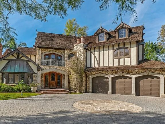 Spectacular 180 city light & mountain views! 3,350 sq ft. 3 bed, 2.5 bath, guesthouse, w/3-car garage, & in-ground spa custom-built, English Tudor-style home boasts multi-layered shake roof w/sprinklers - resembling the old-world UK-style thatched roof. Nestled above all in 24-hr, guard gated, exclusive Monteria Estates! Hawks Hill is a private gated road & leads to the estates gated driveway. Situated on massive land. An extra room off the primary bedroom that can be used as a gym or nursery. Built & constructed w/ the highest level of handcrafted workmanship & elegance. Sweeping curved staircase offers supreme elegance. Unique character & exquisite style includes handcrafted oak wood floors, custom ceilings in every room, leaded & stained-glass windows throughout, rounded French doors, multiple balconies & terraces that offer amazing views. . The family room includes anlarge fireplace w/inglenook. The home includes 3 fireplaces (family room, living room and primary bedroom), surround sound in the family room for entertainment. Custom mosaic tile by renowned master, Harman Shock, which earned the houses an architectural award Convenient entrances on Devonshire St. (leads you to Chaminade Middle School) or another entry/exit (right off Hwy-118 and Porter Ranch The Vineyards). Located near shopping, dining, entertainment, & recreation. Live your fairytale dreams w/this spectacular estate. Owner pays for water. Renter pays for gas and electricity. Flexible leasing terms 6-12+ months