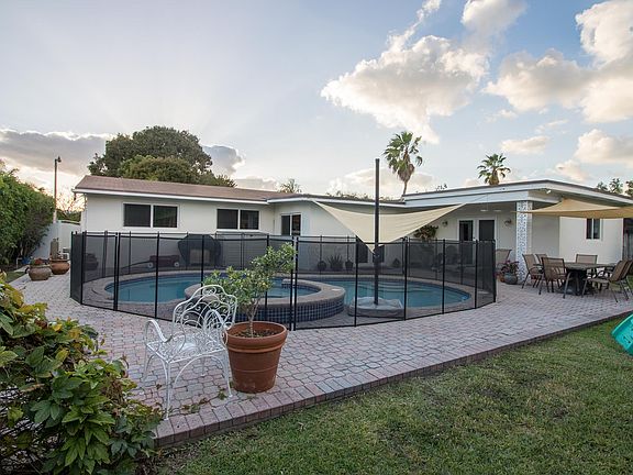 Bathrooms updated, new kitchen with granite counters and stainless appliances, and impact windows and doors in 2012. New LED can lights throughout. Walk in closets and full baths in guest BR and large master suite. French doors in living area and master open to backyard with gorgeous pool and spa in patio with partial roof and shade sails. Backyard bordered by flowers, shrubs, fruit trees and wood fence with locking steel gates to front yard. Shed has power, light, workbench and deep storage built-in.