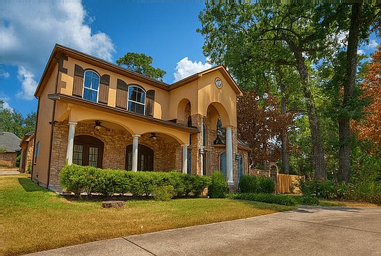 Luxurious 5-bedroom, 4-bath home with 3,433 sq ft of living space, situated on a spacious corner lot next to Pinehurst Golf Course. This European-inspired residence features hand-painted brick-style walls, a grand spiral staircase, a custom home theatre room, and crown molding imported from England, creating a true castle-like feel. The main floor includes a stunning master suite, while a a detached guest suite with bath and office space offers versatility. Set on nearly half an acre, the property provides ample outdoor space for relaxation and entertainment. Additional highlights include central heating and air, a detached 2-car garage, and appliances such as refrigerator, stove, microwave, dishwasher, washer, and dryer. Located in the highly rated Atascocita ISD, this home is offered at $3,500 unfurnished or $4,000 furnished, with pets welcome (fee applies). Tenant is responsible for all utilities and lawn care.