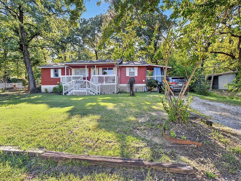 Charming home situated across the street from the late on three parcels, +or - half an acre. The kitchen has been nicely updated with solid surface countertops, stainless style stove, microwave and updated cabinets. Spacious add on living room at the back of the home features a stunning wall to wall fireplace, beautiful mantle, great focal point and tin on the ceiling. Split primary bedroom has an adorable covered patio, you will love it. Engineered wood flooring in the dining room, kitchen, hallway and living room. Enjoy multiple outdoor spaces, 3 patios total, in addition to the front porch, mature trees and plenty of room to make this property your own. Wonderful above ground pool with decking and lots of trees and plants to enjoy the hot Texas summers. With some TLC, this could be your retreat. Buyer will need to buy a new survey, seller does not have one. Home being sold as is.