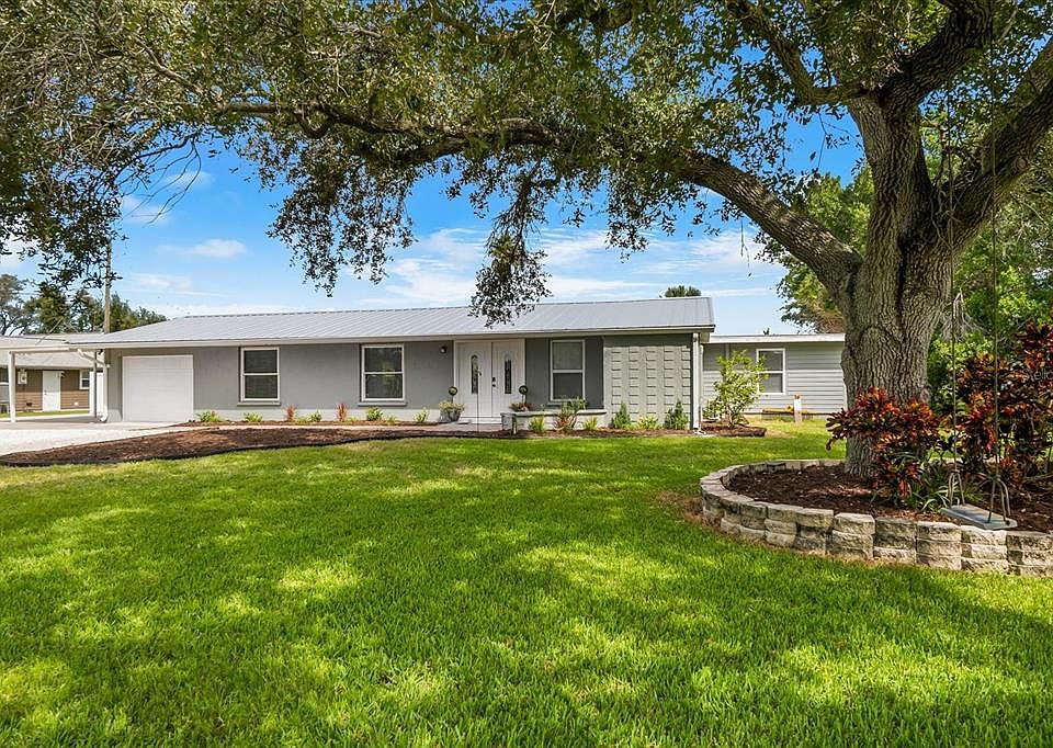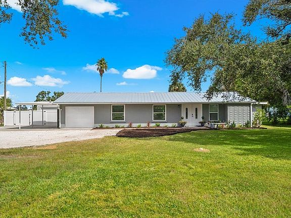 One or more photo(s) has been virtually staged. Welcome to your private retreat! Situated on 1.25 acres with peaceful lake views, this beautifully updated 3-bedroom plus den home combines comfort, style, and the best of the Florida lifestyle. With no HOA or deed restrictions, you’ll have the freedom to bring your boat, RV, and all your toys. The versatile den makes a perfect office, hobby room, or playroom and can easily be converted into a 4th bedroom. Inside, an open floor plan features a spacious main living area, a kitchen with stainless steel appliances, abundant cabinetry, and a large island for gatherings. Striking porcelain plank floors add warmth while hurricane-impact windows fill the home with natural light. The owner’s suite includes a renovated ensuite bath and walk-in closet. Upgrades include a new metal roof (2025), pool pump (2024), HVAC (2023), and a 50-amp RV plug. French doors lead to your personal outdoor oasis with a sparkling pool, generous concrete deck, and covered lanai, ideal for entertaining or relaxing under the stars. The property also offers a 1-car garage with carport plus two outdoor sheds, providing plenty of storage and workspace. All this privacy is just minutes from Emerson Point, Bradenton Riverwalk, shopping, dining, and I-75.