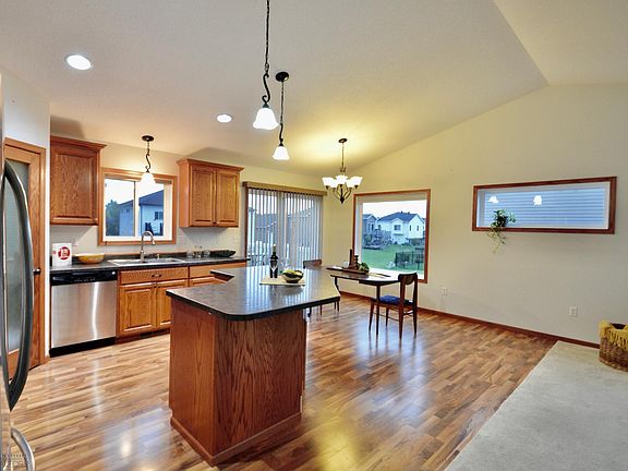 Let the light shine! Welcome to this beautifully maintained home located in Horizon Shores, with parks, schools, & shopping nearby. You will love the sunny open floor plan that overlooks the main floor foyer. This home boasts vaulted ceilings & wonderful woodwork throughout, including solid oak cabinets & doors. Both the living & dining room have south facing transom windows. Off the dining, a patio door leads to the maintenance-free deck & down to a stamped patio in the landscaped backyard. The kitchen features a beautiful island & stainless steel appliances. Additionally, on the upper level, you will find a tasteful primary suite with a walk-in closet, a walk-in shower, vanity with two sinks, a second bedroom, & a full bath with jetted tub. The lower level has a spacious large family room with cozy gas fireplace on cooler days. Plus two more bedrooms, a full bathroom & finished laundry room. You will love all the storage inside the home & the large three stall car garage. Owner updates include, new paint throughout both levels, carpet, added cabinetry to the laundry room, doors to the kitchen island, an updated sump pump with a radon mitigation sytstem, exterior lights, an underground sprinkler system outside, & newer walk-out garage door with a window to let more light in. Call your favorite realtor to see today & fall in love with your next home. Low specials.