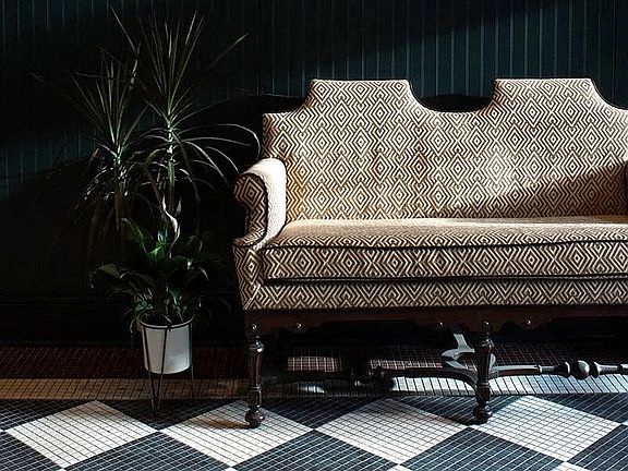 Upon entering, you'll be greeted by a grand lobby featuring striking architectural details. The welcoming common areas boast a distinctive black and white checkered floor, rich dark wood paneling, and a high ceiling with exposed wooden beams, hinting at the building's storied past. Elegant lighting, comfortable seating areas with plush armchairs and sofas, and carefully curated artwork create an inviting atmosphere. You'll find convenient mailboxes, often with charming vintage-inspired designs, and easy access to upper floors. A sense of community is fostered in these stylish shared spaces, offering residents a place to relax or socialize.