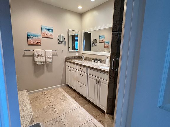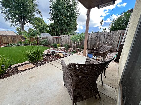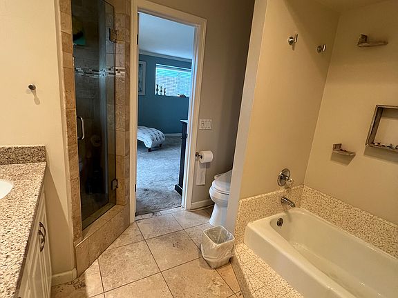 Spacious, fully furnished master bedroom in a quiet Escondido home. The room includes a king bed, TV, dresser, lounge chair, mini refrigerator, and a safe for your belongings. You also get a private master bathroom with double sinks and a walk-in shower, plus direct access to a peaceful backyard patio.