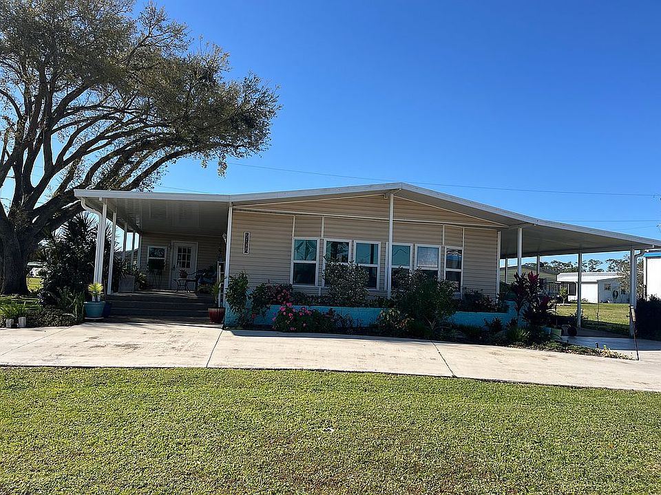 This triple wide is centrally located in Sebring Falls, a 55+ community where you own your lot and pay low monthly dues, with access to clubhouse, pool and storage compound. This large corner lot has circular drive and straight drive with long carport. 10X25 porch is newly epoxied.