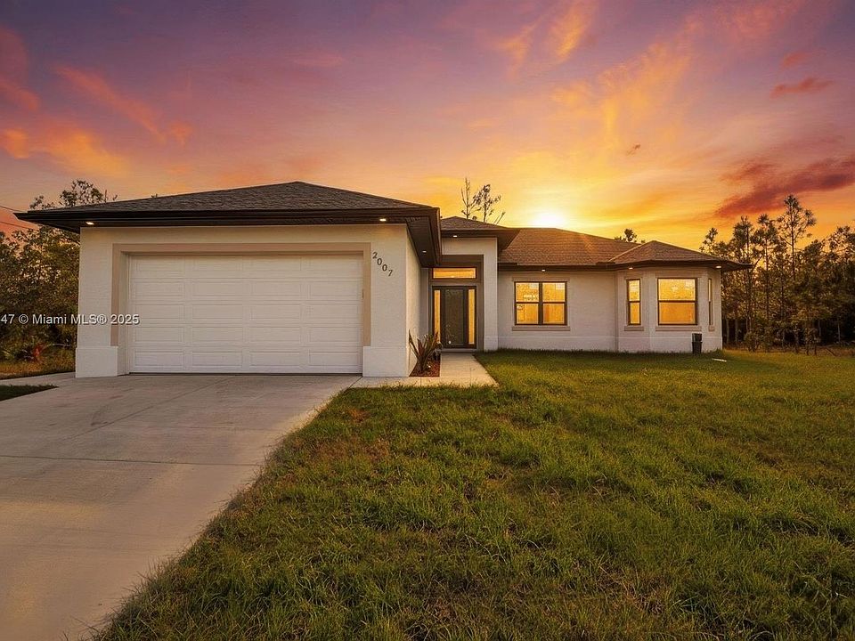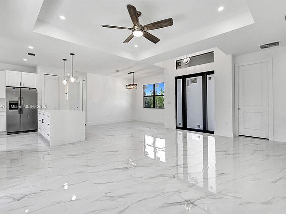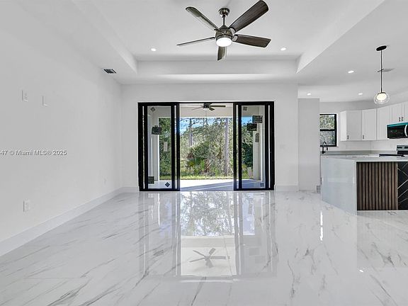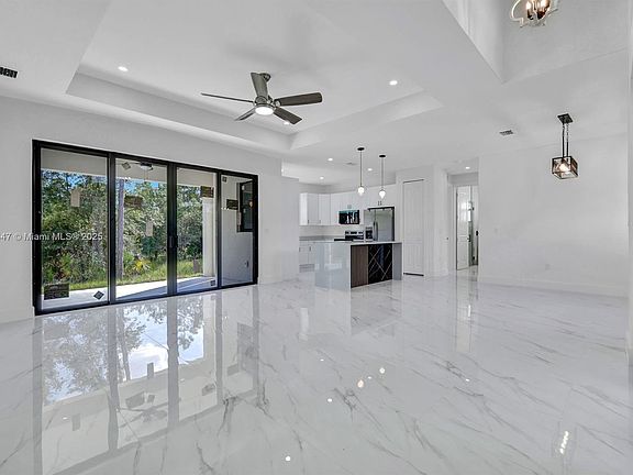 Brand new 2025-built 3BR/2BA home on a quiet street in Lehigh Acres offers 1,569 sq ft of open-concept living. High-end finishes include porcelain tile floors (no carpet) and quartz countertops in kitchen and baths, plus a gourmet kitchen with stainless appliances. Covered lanai off living area for outdoor dining; the primary suite has a private lanai perfect for morning coffee or stargazing. A split-bedroom design ensures privacy, and the master suite has two walk-in closets and a spa-like bath with dual sinks. Impact windows/doors, Flood Zone X (no flood ins. req.), and a 1-yr builder warranty offer peace of mind. No HOA, near parks, trails, golf, shopping, dining & schools. FHA/VA financing welcome; seller offers $7,000 toward buyer's closing costs with full-price offer.