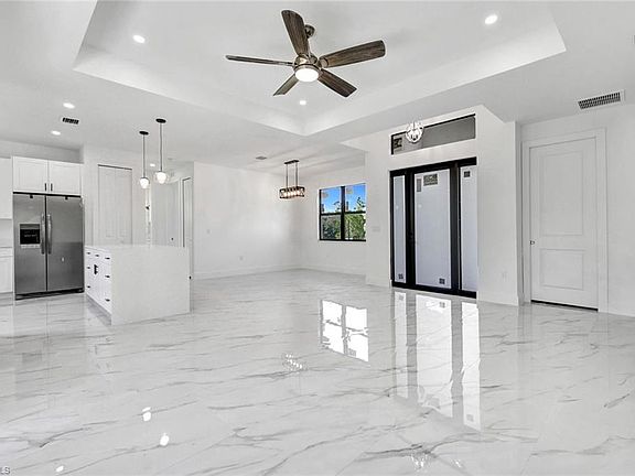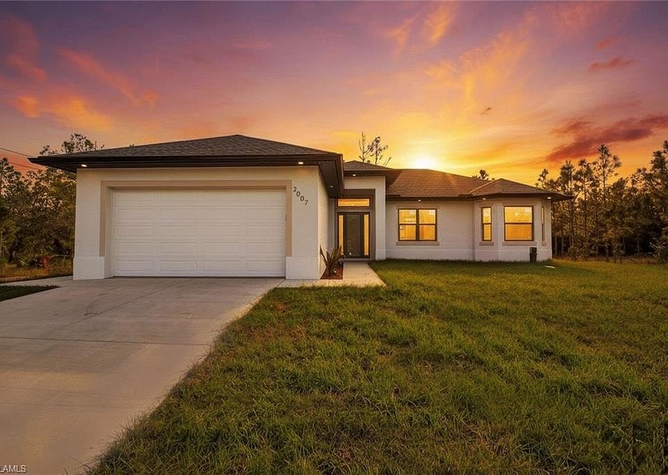 Experience modern luxury and family-friendly living in this brand new 2025-built home, ideally situated on a quiet street near Joel Blvd in Lehigh Acres. This spacious 3-bedroom, 2-bath residence offers 1,569 sq ft of air-conditioned living space (2,153 sq ft total) with a bright open-concept floor plan and high-end finishes throughout. Luxury upgrades include porcelain tile flooring (no carpet) and quartz countertops in the kitchen and both bathrooms. The gourmet kitchen shines with a complete stainless steel appliance package (washer/dryer not included). Every bedroom is equipped with a foldable ceiling fan and modern lighting fixtures for comfort and style. Impact sliding glass doors open to a covered lanai, perfect for outdoor dining. The primary suite even has its own open lanai, an ideal spot for morning coffee or stargazing. A split-bedroom layout ensures privacy for the primary retreat, which boasts his-and-hers walk-in closets and a spa-like shower with a dual-sink quartz vanity. Quality construction features impact-resistant windows and doors, and the home sits in Flood Zone X (no flood insurance required). Enjoy added peace of mind with a 1-year builder warranty included. Situated in a growing community with no HOA fees, this property offers both tranquility and convenience. You're just minutes from family-friendly recreation at Veterans Park, Harns Marsh Preserve, the Lehigh Acres Trail, and local golf courses. Daily errands are easy with nearby restaurants, grocery stores, and schools. Plus, the area is seeing major public investments in infrastructure and amenities. A new $60+ million high school/middle school campus is slated for completion by 2027, and ongoing road upgrades, park expansions, and new healthcare facilities will further enhance the neighborhood's future value and lifestyle. This home is eligible for FHA and VA financing, making it an excellent opportunity for a wide range of buyers. Seller will contribute $7,000 toward buyer's closing costs with full-price offer.