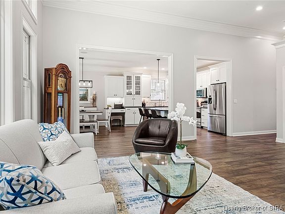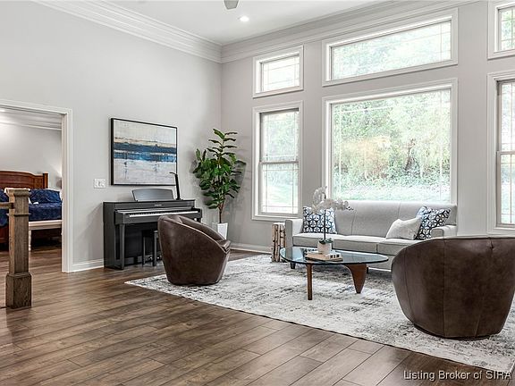 Welcome to this pristine, custom-built 4-bedroom, 3-bath home in the highly sought-after Charlet Ridge community of Floyds Knobs—located less than 5 minutes from Floyds Knobs Elementary and Hwy 150! With over 3,100 total finished square feet, this beautifully updated home offers upgrades galore & a functional, open floor plan perfect for modern living. Step into a welcoming foyer that flows into a spacious great room with soaring 12-foot vaulted ceilings & expansive windows that fill the space with natural light. The updated kitchen features custom cabinetry, sleek black granite countertops, marble backsplash, & island with a breakfast bar, all opening to a generous dining area that leads to a covered patio. The split-bedroom layout includes a spacious primary suite with tray ceiling, ensuite bath, & a huge walk-in closet with custom shelving. Two additional bedrooms & a full bath complete the main level. Downstairs, a new white oak staircase leads to a large family room with a cozy gas fireplace featuring a reclaimed Indiana barn beam mantle & built-in ceiling surround sound. The finished lower level also includes a private 4th bedroom, full bathroom, sewing/craft room, & storage room with ample space. Exterior highlights include a 3-car garage with epoxy flooring, fresh landscaping, an irrigation system, extended parking pad, & a GenerLink generator adapter for added peace of mind. You won’t believe the extras & upgrades this exceptional home has to offer—truly a must-see!