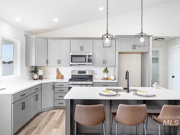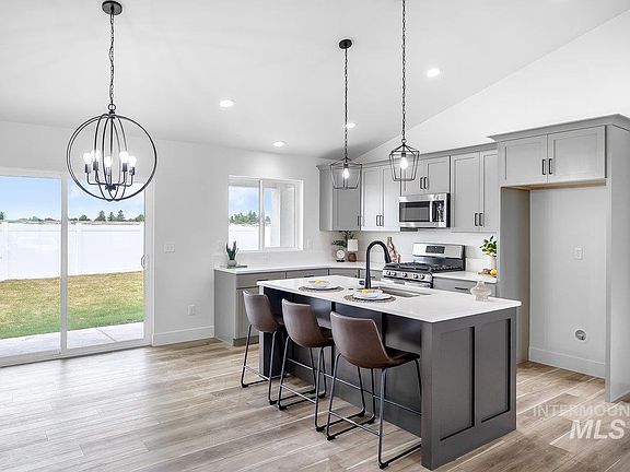 This beautifully designed residence, built by CA Homes, Parade Winner, Magic Valley Builder's Parade of Homes, 2023 & 2024, offers an open-concept design with vaulted ceilings, 4 bedrooms, 2 baths, and 1480 sqft., of living space. The home is thoughtfully appointed with quartz countertops, locally made soft-close cabinets, luxury vinyl plank flooring, and plush carpeting. The kitchen features a four-burner gas cooktop with a griddle and there is plenty of storage throughout the home. In addition, enjoy modern elegance from Pfister matte black plumbing fixtures throughout. The property is light and bright, and the 2-car garage is finished with baseboards! This property also includes natural gas, a fully fenced yard, and RV parking. Discover your dream home in Sundance, Twin Falls, Idaho! ***Photo's are from a previous listing***