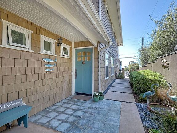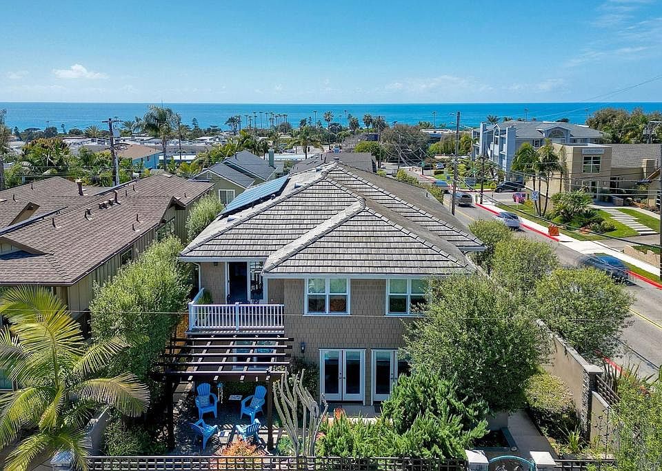 Discover unparalleled luxury living in this modern coastal retreat, perfectly situated just steps from the beach, Cardiff Seaside Market, fine dining, and the coastal rail trail. Boasting a unique blend of contemporary design and coastal charm, this home offers 3 bedrooms plus an office and 4 baths. Step inside to experience a seamless fusion of modern design and coastal inspired decor. The light-filled living spaces feature high ceilings, hardwood floors, large windows and french doors to capture the views of the ocean and spacious deck. Enjoy the spectacular sunsets, ocean views and coastal breezes while sipping a beverage by your custom firepit. The chef's kitchen is a culinary masterpiece, with lovely granite countertops, large island with extra storage, sub-zero refrigerator, and beautiful cabinetry. The wine frig and bosch dishwasher also make hosting a breeze. Entertain family and friends in the expansive bonus room. With ample space for seating, a storage closet, and beautiful guest bath with marble floor and shower, this room is perfect for hosting gatherings or enjoying laid back evenings with loved ones. If needed, it could be easily converted into a guest suite or extra bedrooms. Retreat to your primary suite, complete with a spa-like ensuite and walk in closet. Just outside the french doors of the bedroom is a custom fountain, sitting area, and meticulously landscaped sea garden, to enjoy your morning coffee or evening glass of wine. Enjoy the ultimate convenience of a private elevator providing easy access to the second level of the home. Whether you're carrying groceries from the garage, or simply want to avoid the stairs, the elevator adds an extra layer of comfort and design. This home offers ample parking with a 3-car garage, and 4 additional spaces in the driveway, providing plenty of room for guests or multiple vehicles. With parking at a premium in Cardiff, this is definitely a huge asset. The garage also has a tesla outlet, and is perfect for storing surfboards, bikes and all your beach needs. Paid off solar panels save you dollars. Don't miss this rare opportunity to own a piece of coastal paradise with all the modern amenities you desire.