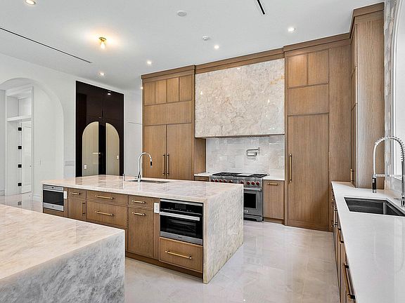 At the heart of the home lies a showstopping double-island kitchen anchored by Cristallo quartzite countertops, custom cabinetry, a hand-fired clay backsplash from Italy, and a full suite of Wolf, Sub-Zero, and Miele appliances. A separate butler's kitchen offers an additional cooking station, ideal for catering or entertaining on a grand scale. The dining room, anchored by arched entryways and a sleek wet bar, sits adjacent to a spacious great room with coffered ceilings, motorized shades, and a gas fireplace clad in marble.