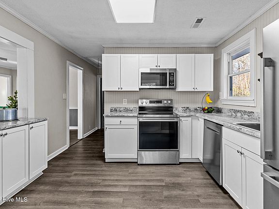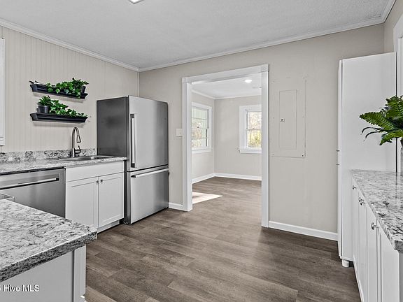 Adorably remodeled 3 bedroom, 1 bath home located in Elizabeth City. Brand new kitchen with stainless appliances, fresh paint and new flooring throughout. This home also has a brand new HVAC and new water heater. Spacious living and dining rooms are open to the kitchen. Additional storage space in back that could be used as a mudroom or utility room/storage.