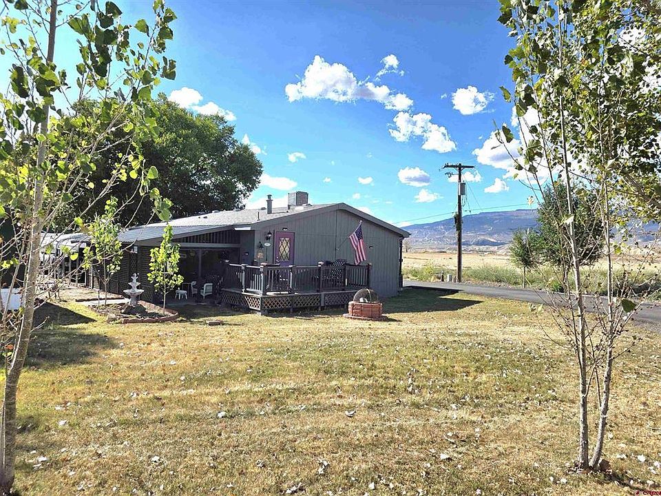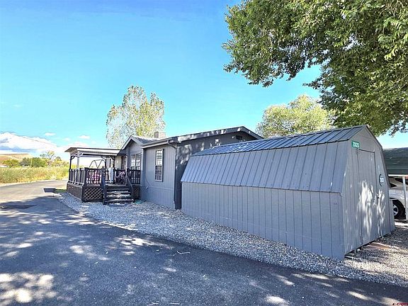 Charming Home in Cherry Acres Mobile Home Park. Manufactured home only. Discover this impeccably maintained, fully remodeled 3-bedroom, 2-bath residence in the Cherry Acres community. The front door faces north, offering unobstructed views of the stunning Grand Mesa with no neighboring homes in sight. Inside, the home boasts an inviting eat-in kitchen and ample storage throughout—many improvements and upgrades. New tile walk-in shower, new flooring and carpet have been installed, and the house has been painted inside and out! Enjoy outdoor living with a spacious front porch, an east-facing side deck, and sun-soaked concrete patios on the south side—perfect for soaking up the winter sun. The beautifully landscaped yard features vibrant flower and vegetable beds. Additional highlights include a covered double carport and a generous 20x10 detached storage shed. This is a must-see property with a current park rate of $577/month