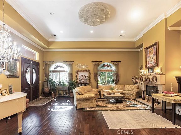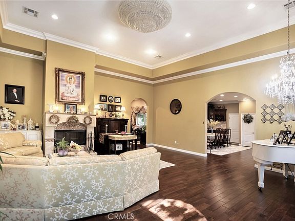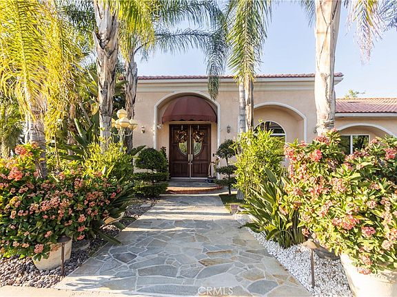 GORGEOUS, TURN-KEY, DREAM HOME WITH LUSH LANDSCAPING AND SEPARATE ENTRY ATTACHED APARTMENT/ADU! This beauty features details and upgrades throughout. As you step through the garden and into the grand, double doors you will find a welcoming open living room with engineered wood floors, 14 foot ceilings, crown moldings, custom drapery, chandeliers and a glass tile/stone fireplace. The gourmet chef's kitchen features beautiful cabinets, granite counter-tops, an industrial range, stainless steel appliances, farmhouse sink, and a separate wet bar. The primary bedroom suite comes equipped with a full bathroom with Jacuzzi tub, two separate walk-in closets, and a sliding glass door to the patio area of the backyard. There are two other large bedrooms in the main level of the home and another full bathroom. With separate entry, a studio apartment/ADU is located on the lower level of the home. At approximately 800 sq ft it is upgraded with wood floors, a kitchenette and full bathroom, perfect for the multi-generational family or to generate rental income. The exterior has mature landscaping with lighting, and fruiting trees including Dragon Fruit, Logan, Persimmon, Lemon, Lime, and Guava. The covered patio contains a built-in BBQ and sitting area. The property has a water collection system, rain gutters, solar panels, artificial turf and a water softener system. Located in the hills of Riverside, with beautiful mountain views giving a rural feel while also being close to freeways, colleges and shopping.