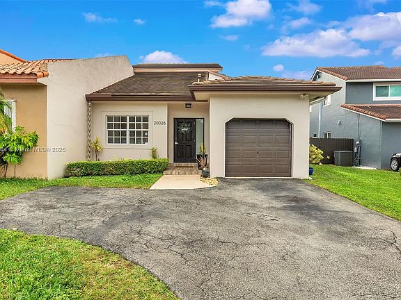 Welcome to 20026 W Lake Drive, a beautifully updated 3-bedroom, 2-bath home in the desirable Country Club of Miami community. This attached single-family residence features an updated kitchen with stainless steel appliances, tile and laminate wood flooring, and a functional layout with two bedrooms on the ground floor and a private master suite upstairs. Boasting 1,865 sq. ft. of living space on a generous 5,372 sq. ft. lot, the home offers a spacious yard, a covered porch perfect for entertaining, and a 1-car garage. The flat tile roof adds to the home's charm and durability. A perfect blend of style and comfort awaits!
